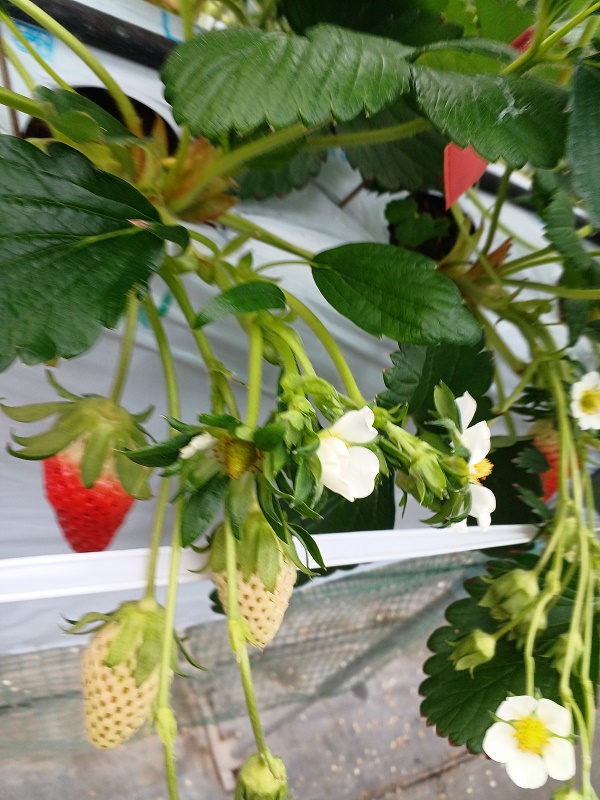 写真2.順路2のかおり野・紅ほっぺ・ホワイトベリー。かおり野の大粒が出てきました。