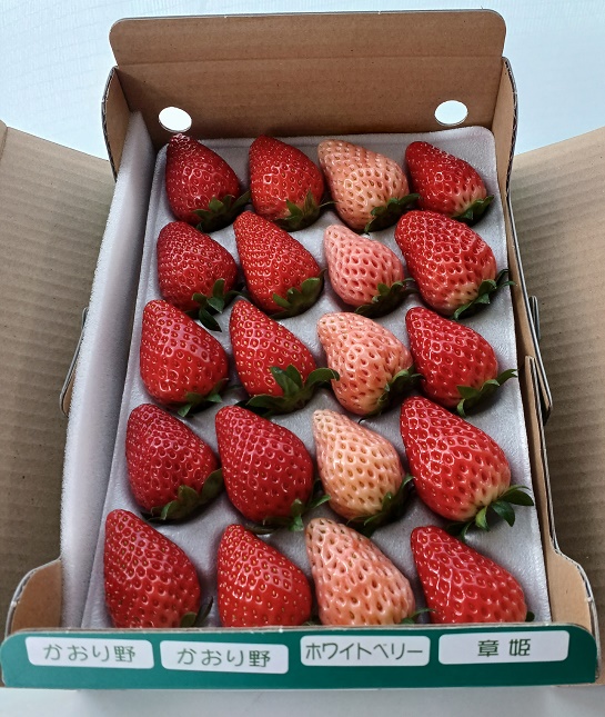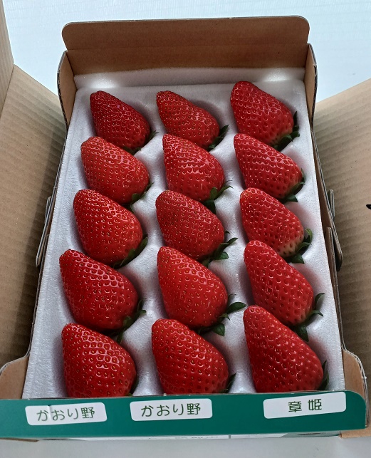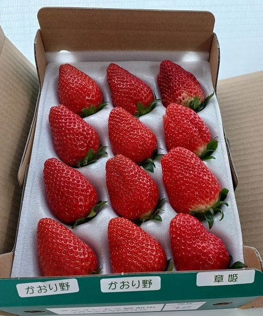 写真7.一番人気の大粒の12個入り。現在旬のかおり野と章姫の組み合わせ。