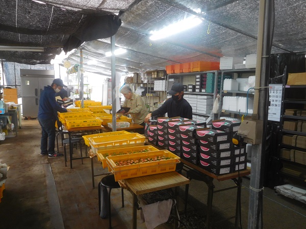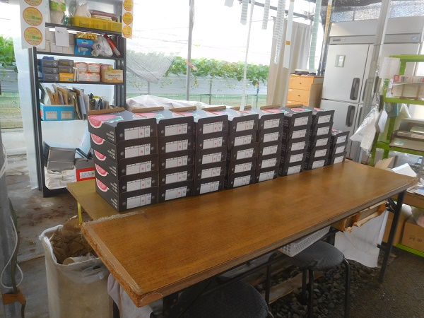 写真5.収穫したら、大粒から贈答用の箱に詰めます。事前に出荷する箱をテーブルに
