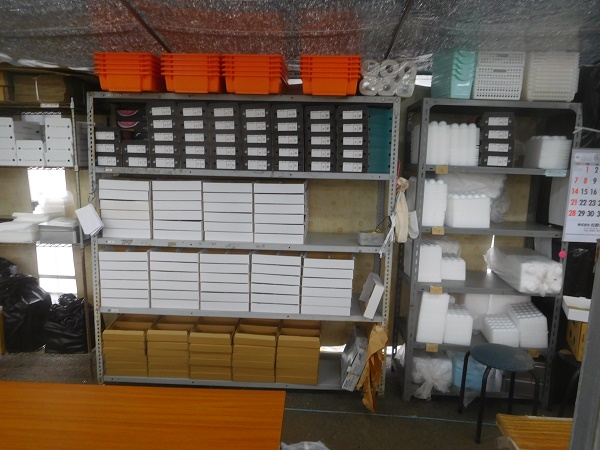 写真2.この棚は、当館の名前で出荷する贈答用の箱と、パックの箱です。