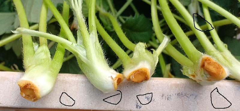 写真3.順路2のかおり野・紅ほっぺ・ホワイトベリー。なぜか収穫が遅れて