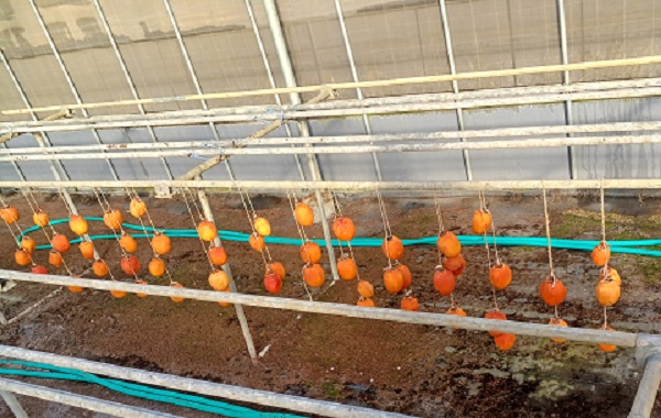 写真10.渋柿を育苗ハウスに吊るしました。