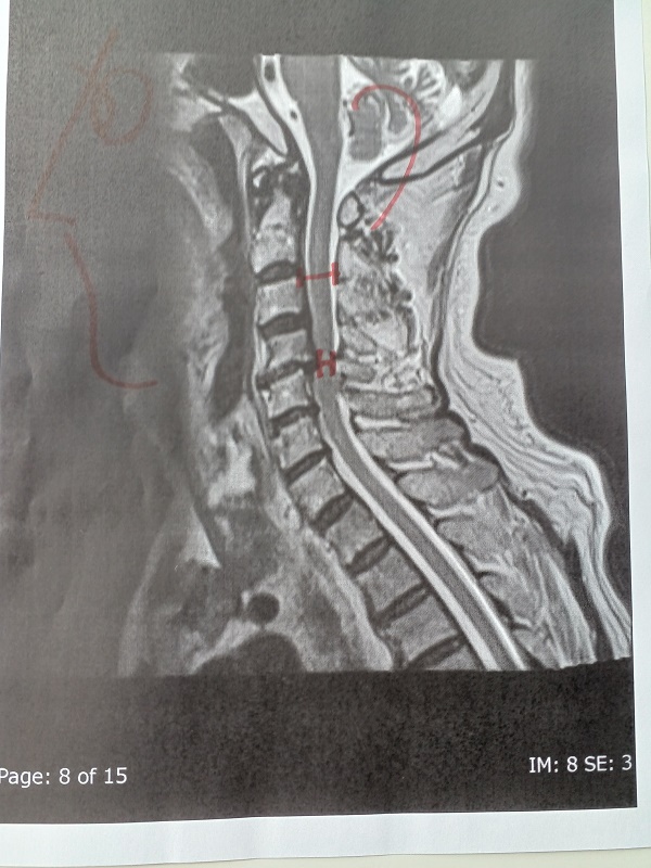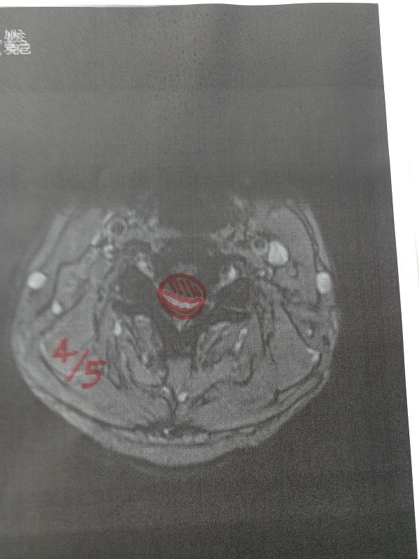 写真11.頸椎の4番と5番の間の神経が、通常の半分まで狭められています。
