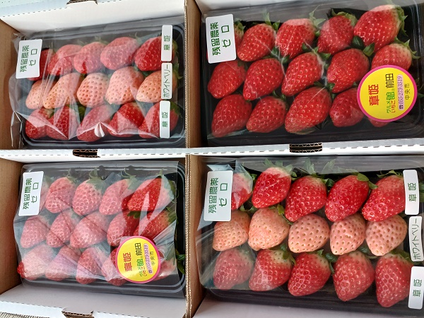 写真1.順路1の章姫。夜冷処理のイチゴと半夜冷処理のイチゴ。