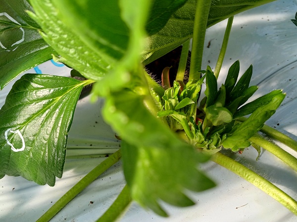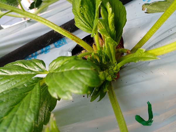 写真3.病害虫の発生を抑えるために、粘着んがかかりやすいようにと、イチゴの葉を減らしています。