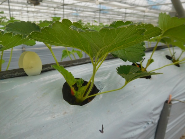 章姫、奥の小ぶりで生育が遅い1本は、夜冷処理の章姫。