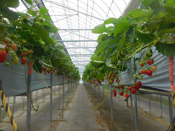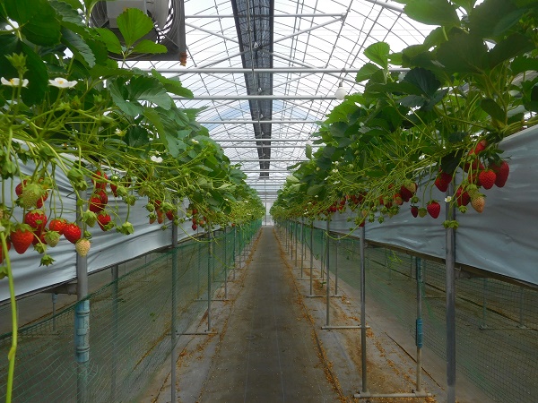 写真1.収穫が終わったばかりの順路2のかおり野・紅ほっぺ・ホワイトベリー。まだまだ